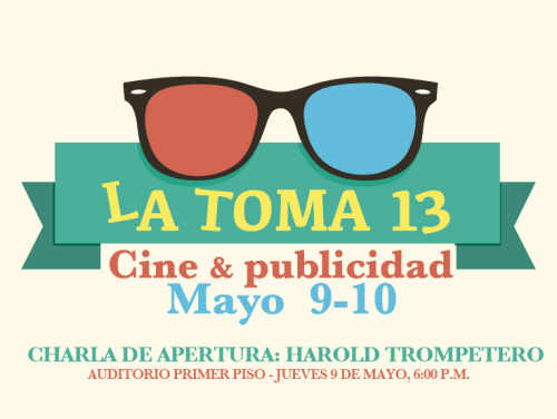 Del 9 al 10 de mayo el Departamento de Publicidad de la Universidad Central tiene programada La Toma 13: Cine & Publicidad, una exposición con los mejores trabajos gráficos, audiovisuales y multimediales de sus estudiantes, que contará con la participación de Harold Trompetero para la charla inaugural y una muestra de cine independiente.